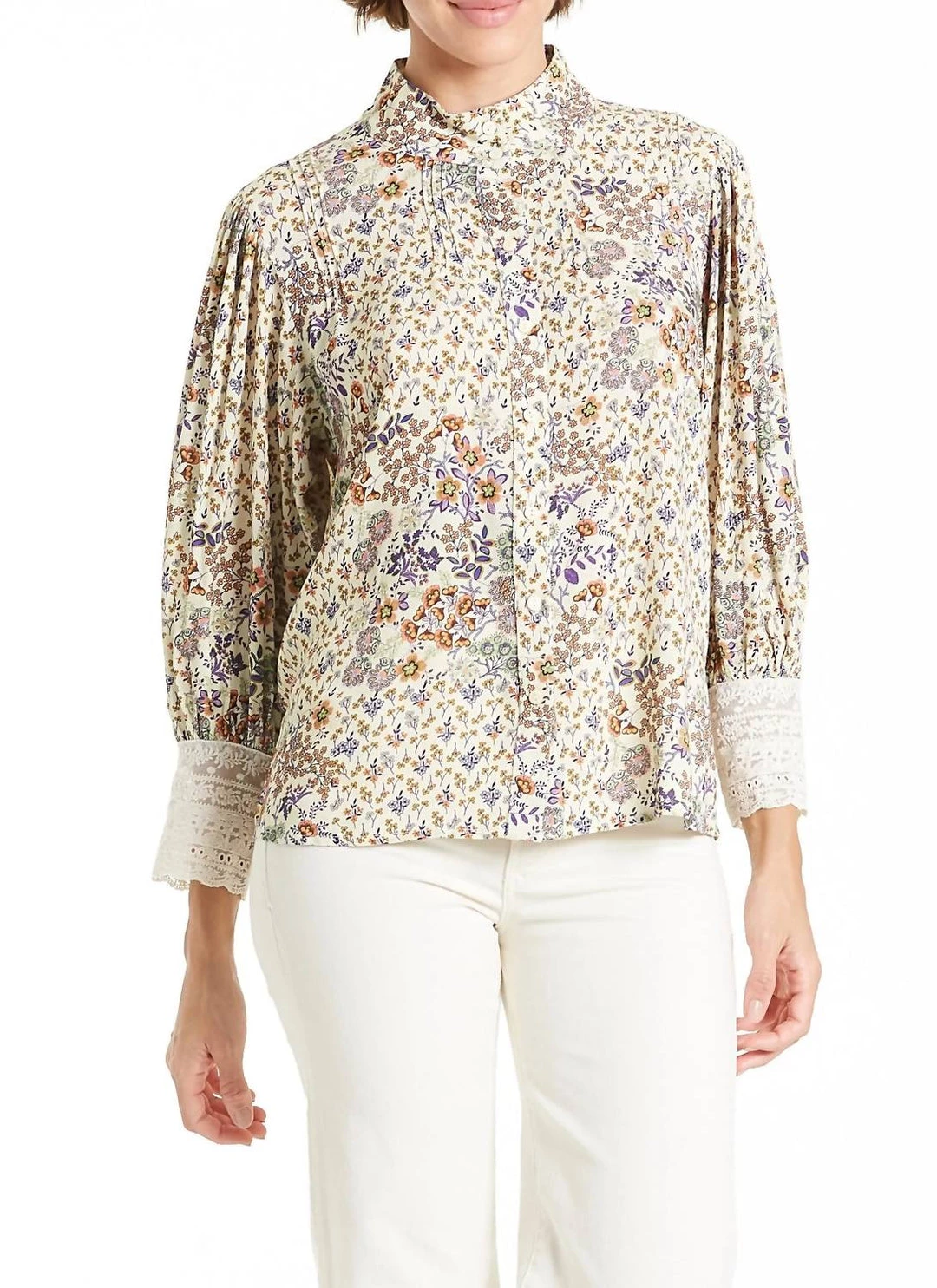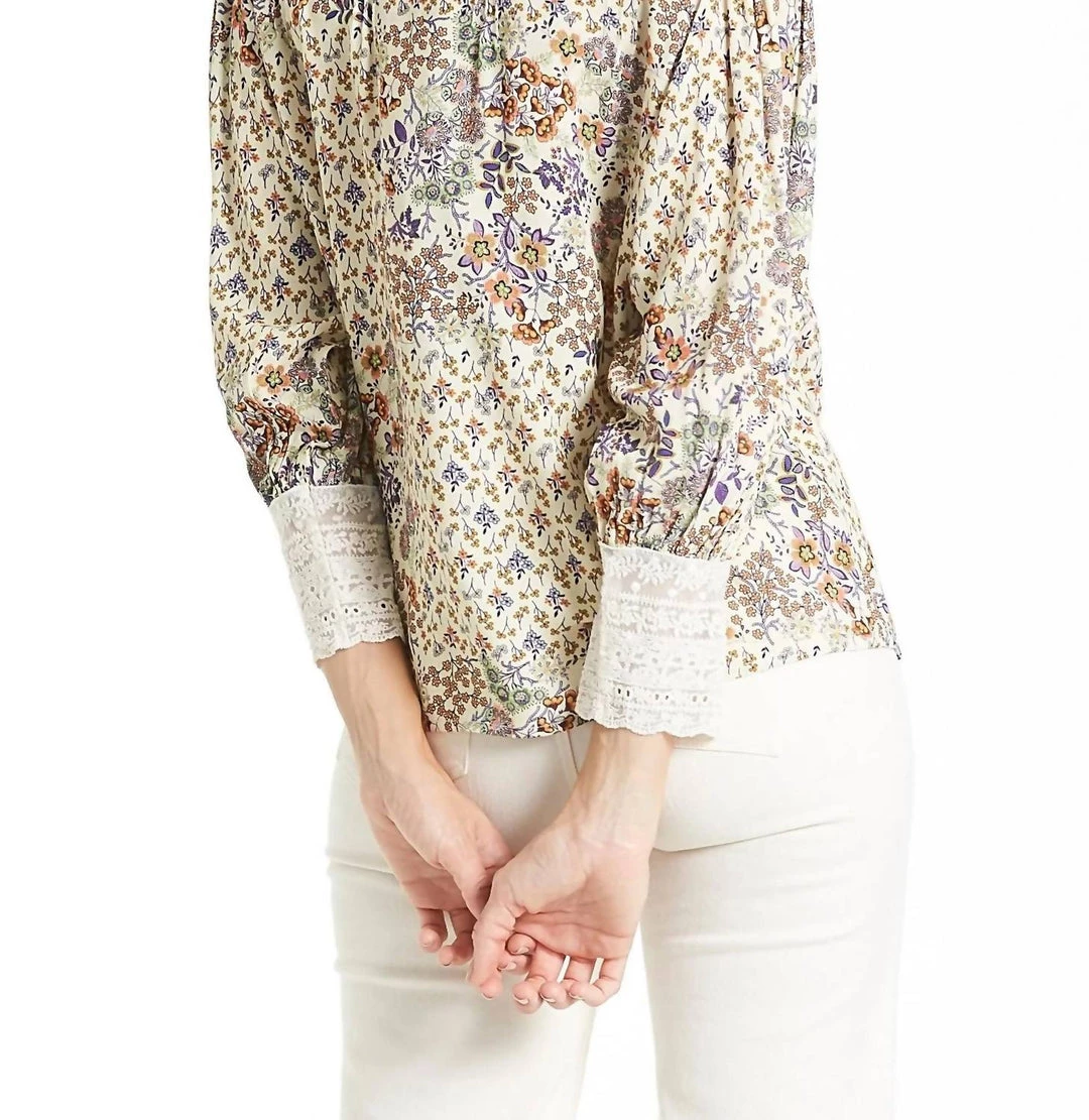 Puff sleeve, pleated body, long sleeve button front shirt finished with collar band & lace trim cuff. Multi print woven on relaxed fit, styled with color buttons.