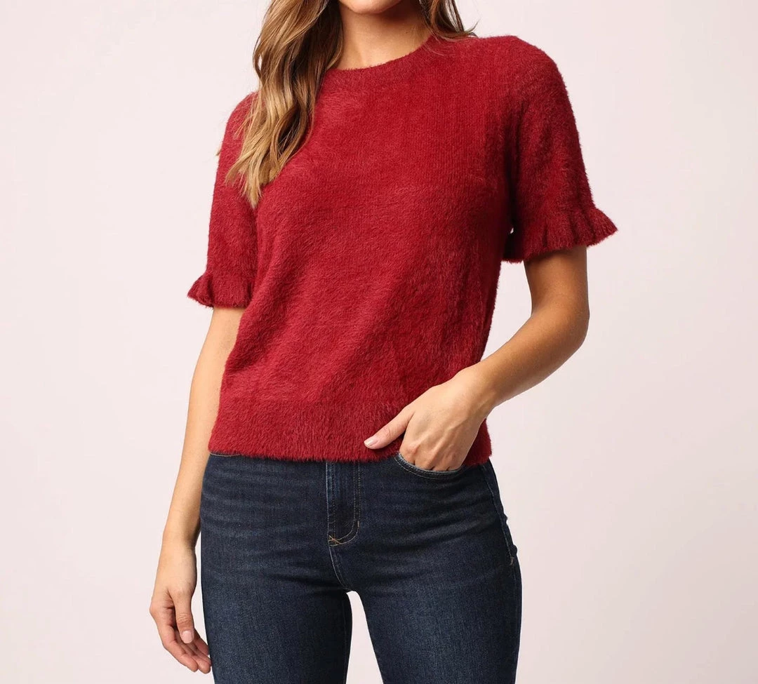 Crewneck sweater with ruffles on the elbow sleeves. Solid color yarn on standard fit.