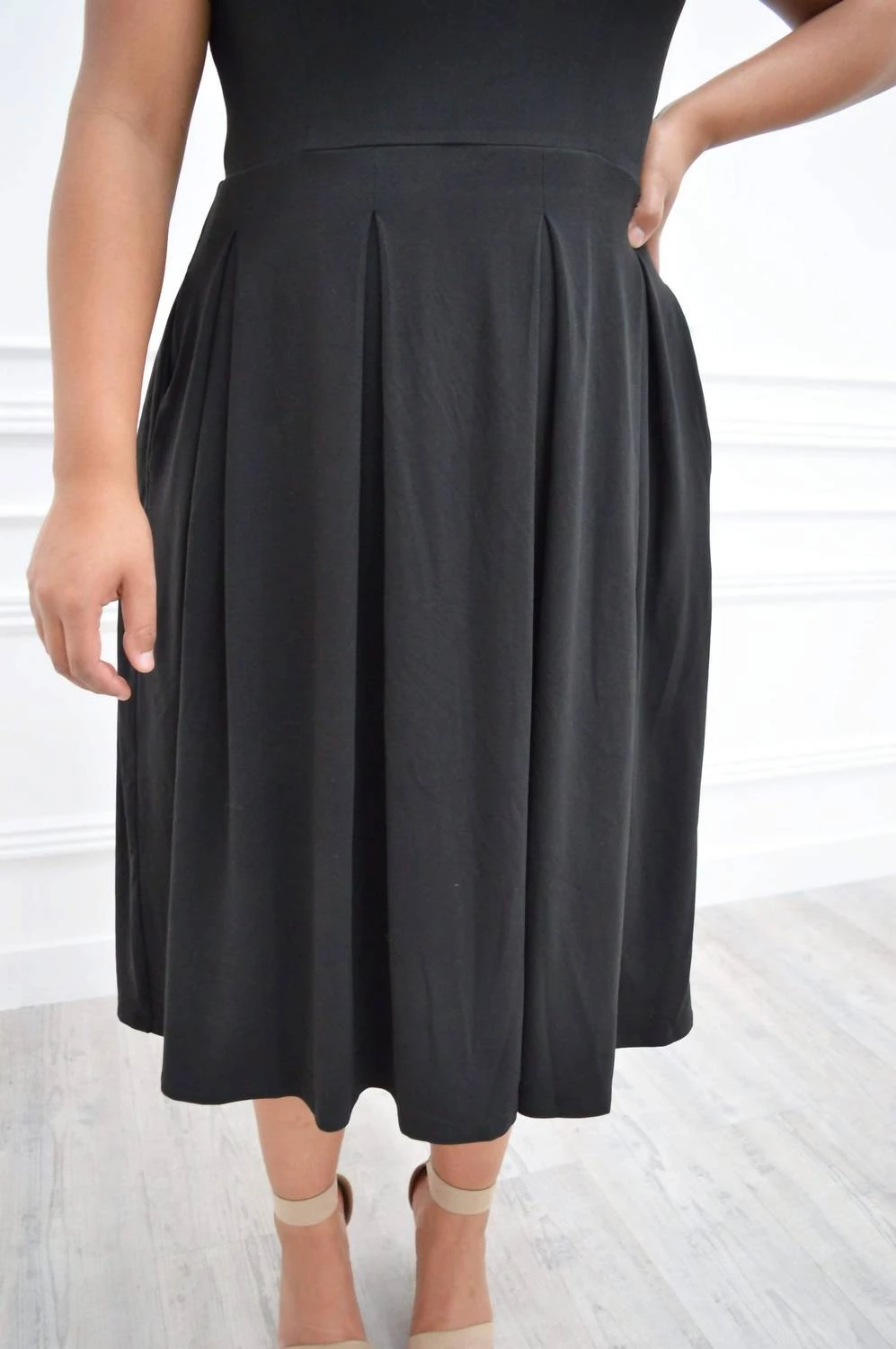 We are crushing hard on this classic pleated midi dress. It is made in our signature buttery soft material and did we mention pockets?Material – 92% poly 8% spandexFit – This dress is fitted on top and flowing through the skirt.Undergarments – This dress can be worn with normal undergarments.Fabric – Fabric has great stretch.All measurements are in inches and laying flat, not stretched.