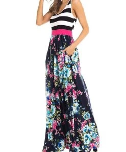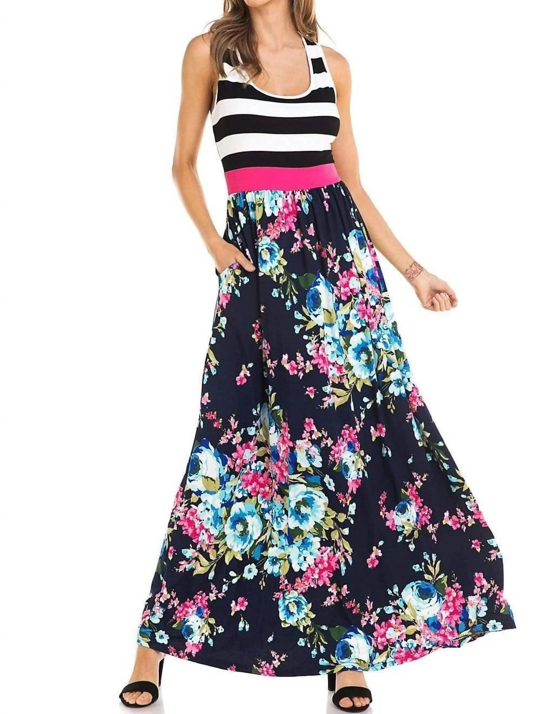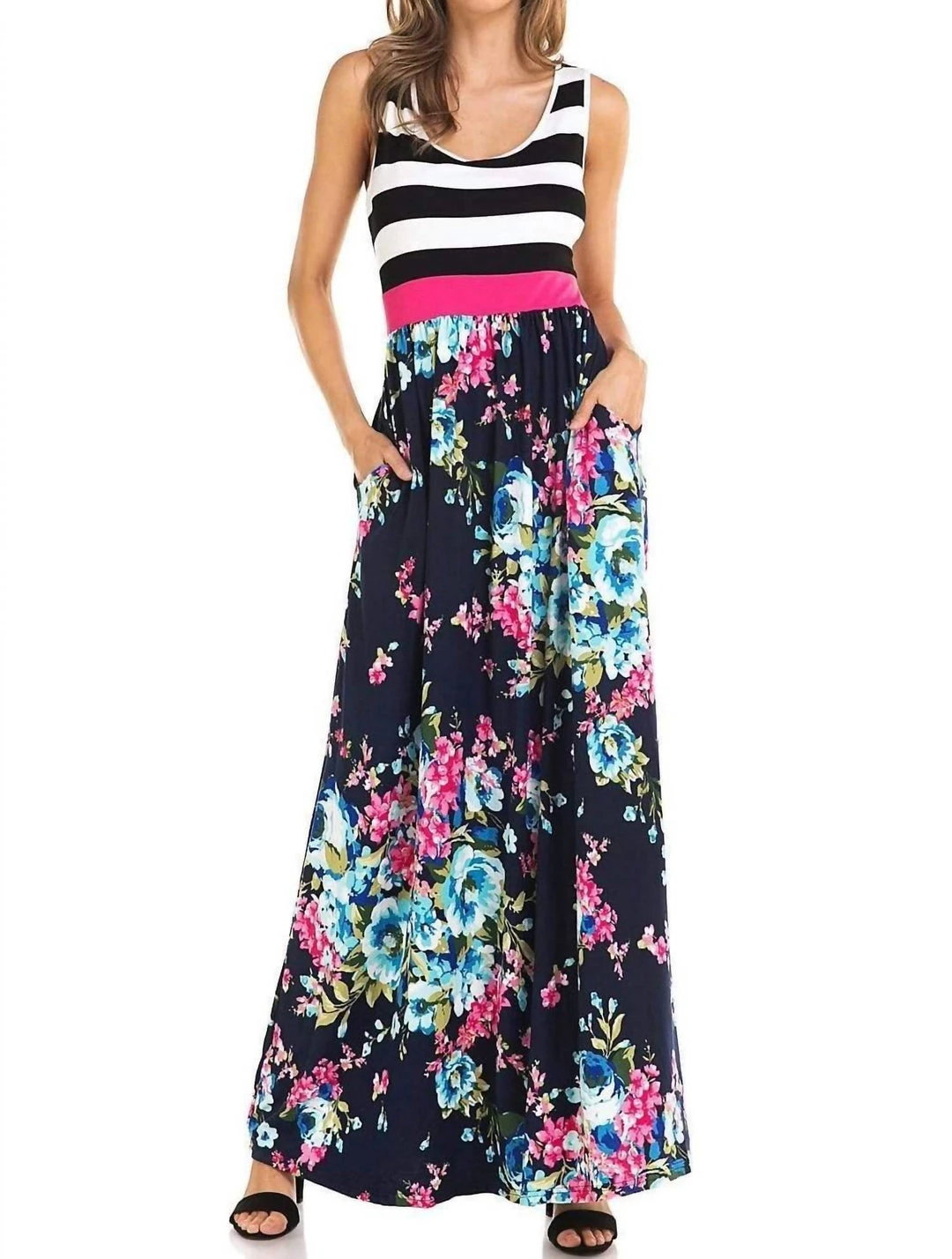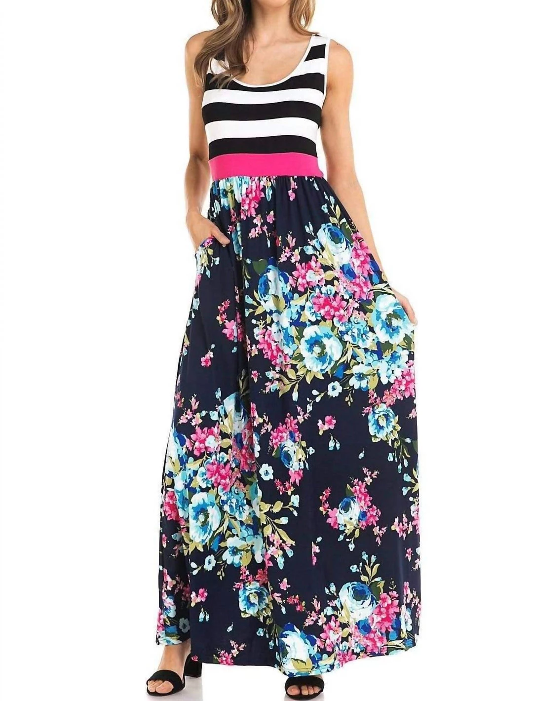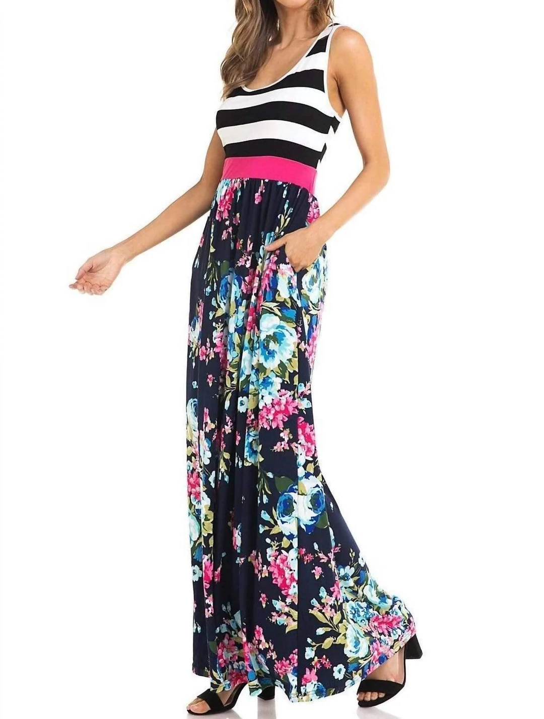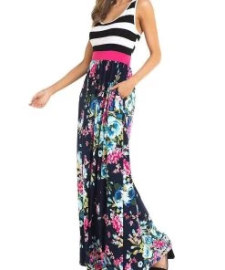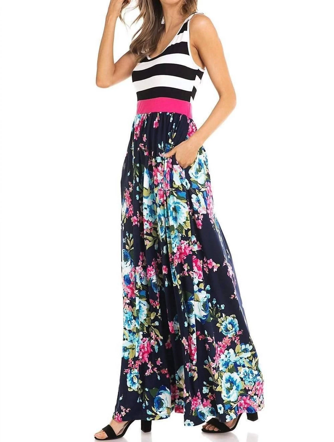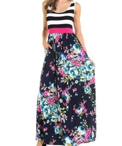 Beautiful non see through floral maxi dress with pockets. The color of the floral pattern may very slightly. The background color is a deep navy. This is our signature buttery soft material.Material – 95% Polyester 5% Spandex