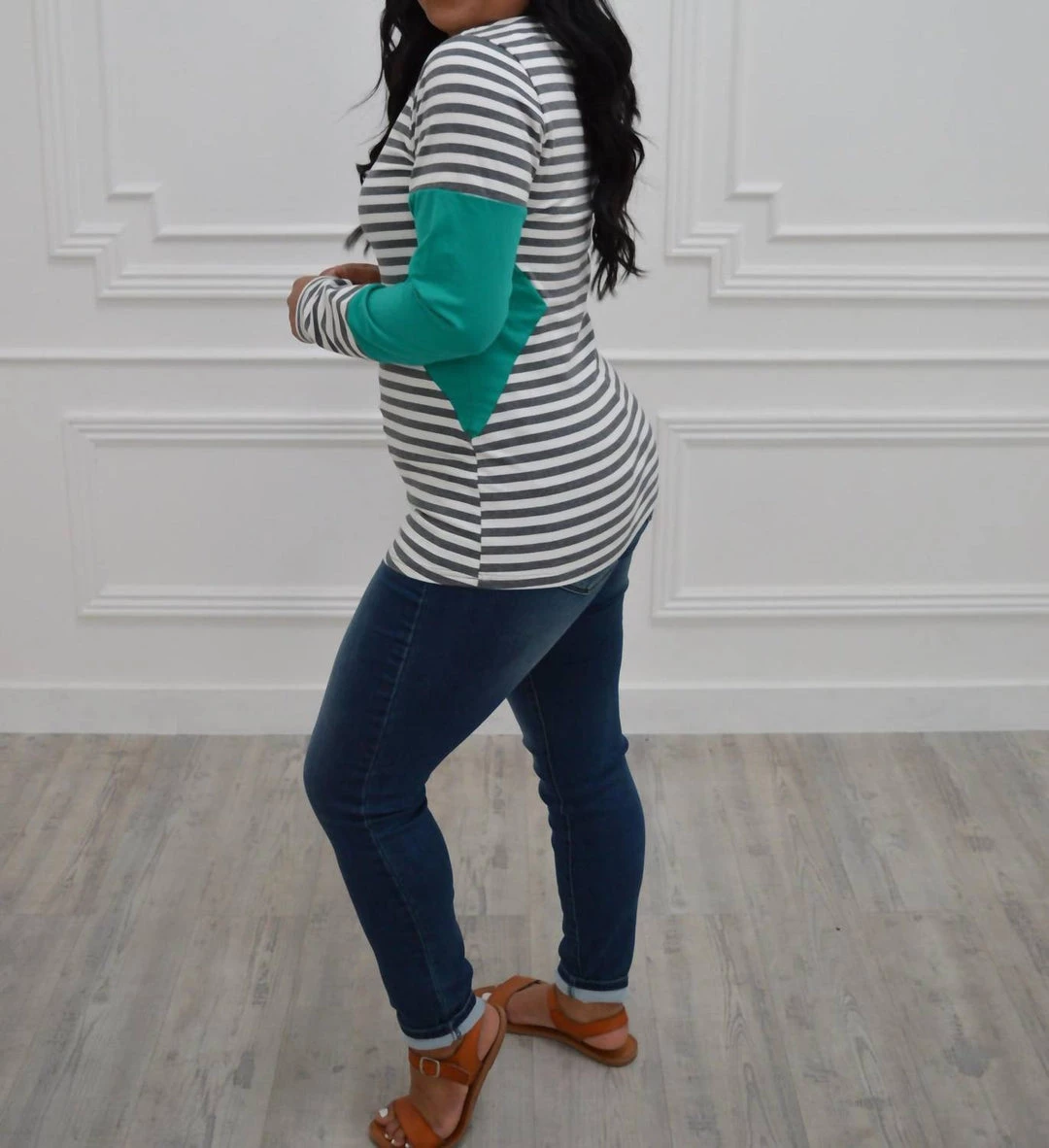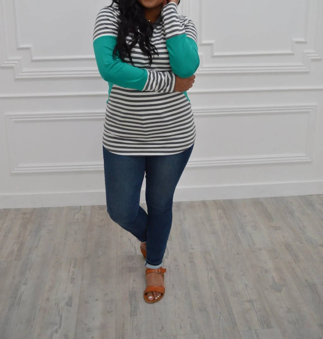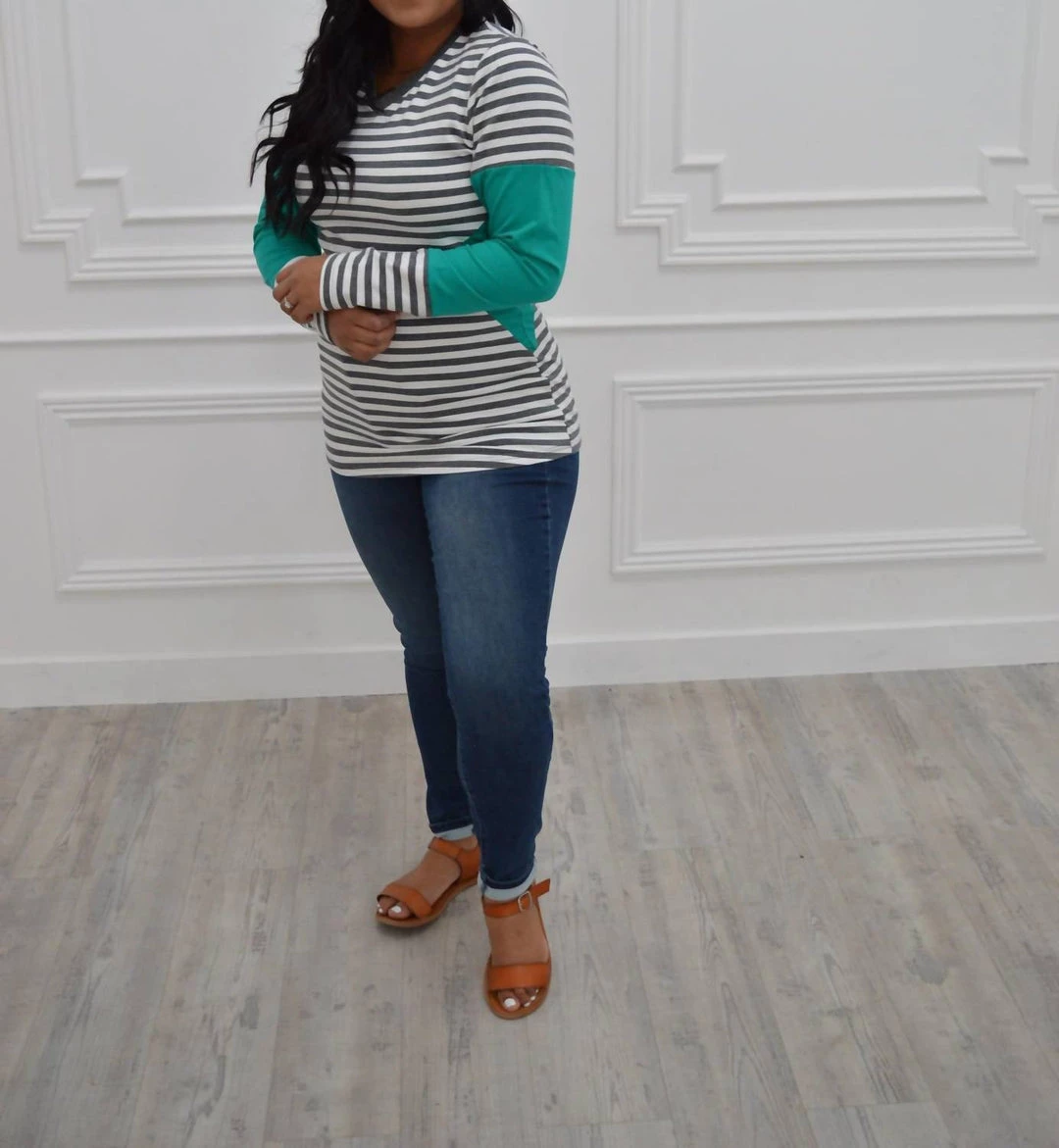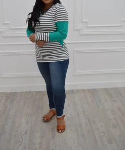 We are going gaga over this stretchy sweater with a bold teal and stripes…did we mention v neck?SIZE CHARTFit – This sweater has an overall fitted fit.Undergarments – This sweater can be worn with a regular undergarments.Fabric – Fabric has great stretch.